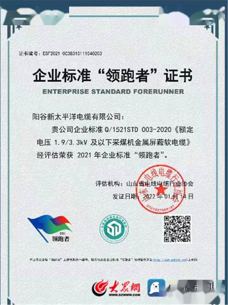 2021年度阳谷县山东日辉电缆集团有限公司、山东bbin宝盈集团有限公司、等5家企业的8项企业标准荣获企业标准“领跑者”证书,获批数量居全市第一位。